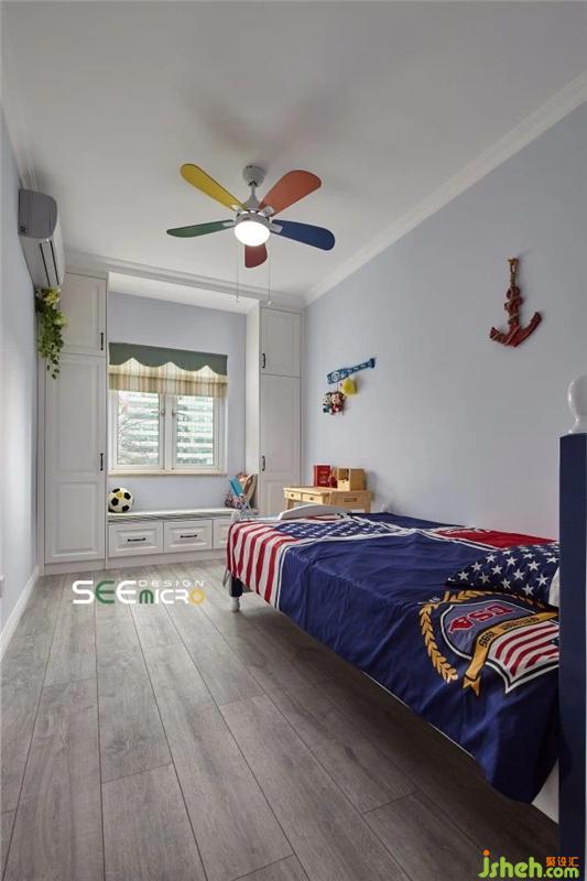 墻壁粉刷成淡藍(lán)色,素凈卻又不失童趣。整個(gè)空間的美式風(fēng)格集中體現(xiàn)在兒童床、床品與墻飾上,海軍藍(lán)與落日紅碰撞出鮮明的風(fēng)格特點(diǎn)。窗兩邊定制了衣柜,中間特意增加了一個(gè)飄窗卡座,滿足儲(chǔ)物功能的同時(shí),又打造了孩子的另一個(gè)玩耍區(qū)。