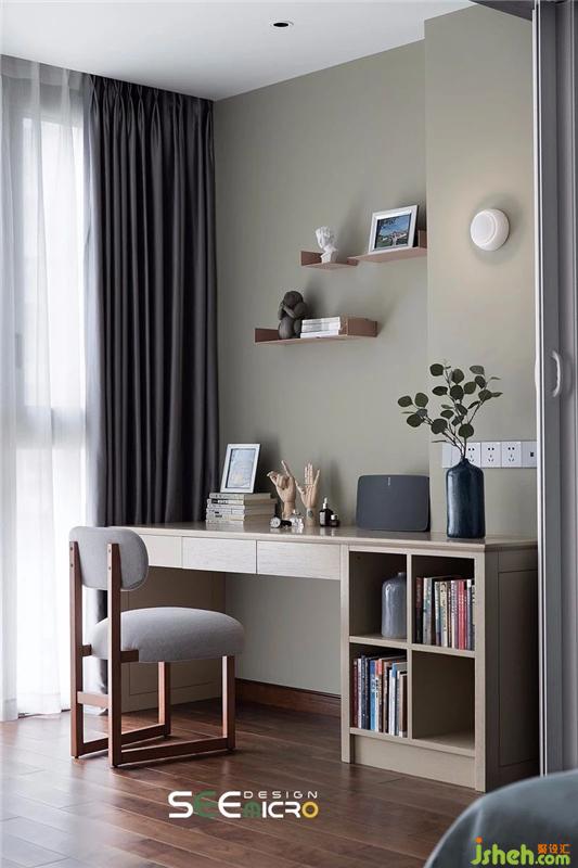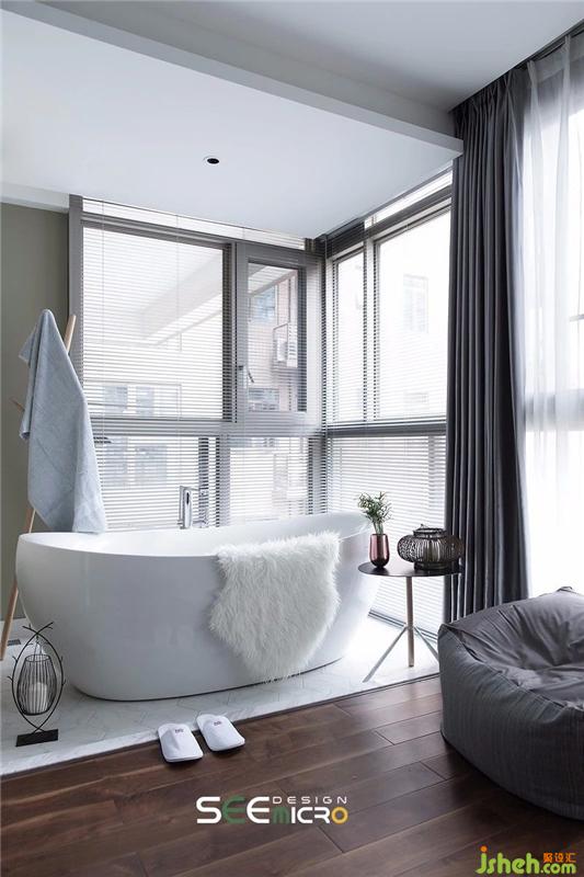 主臥休閑區(qū)9個平方的空間,如果是只是閱讀和書桌還是有點浪費空間。設(shè)計師在大大的落地窗前加了浴缸的功能,既是舒緩壓力的泡澡空間,也是臥室里的一道風(fēng)景。