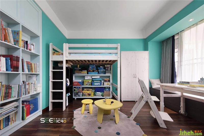 活動空間足夠的大,給孩子不拘束的空間趣味,一大面的書柜也滿足童時期孩子的收納需求。裝修設(shè)計