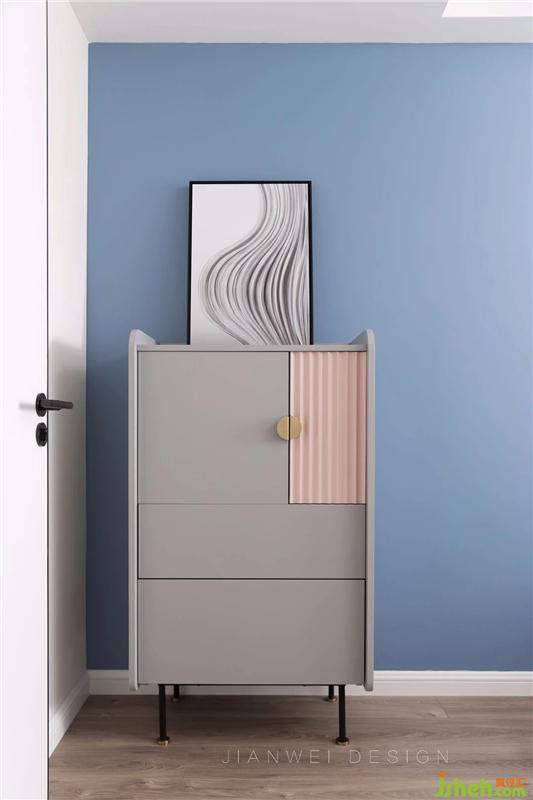 最為亮眼的個(gè)性斗柜,淺灰和煙粉的色彩搭配,溫暖整個(gè)空間。裝飾畫上的柔和弧形,給空間帶來(lái)了靈動(dòng)的氣息。