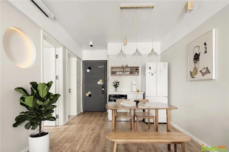安利餐廳好物:①玻璃小吊柜,顏值與實用并存②餐桌旁邊島臺配以石材臺面,小電器神器,石材臺面不怕燙不怕臟。餐桌就可以釋放出來,干干凈凈。入戶大門原本是紅色的。