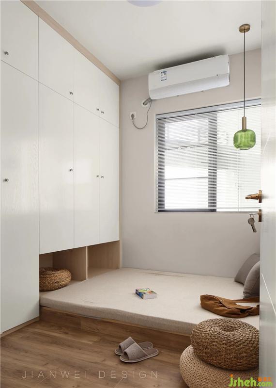 客房延續(xù)了日式調性,收納和居住需求兼顧。裝修設計