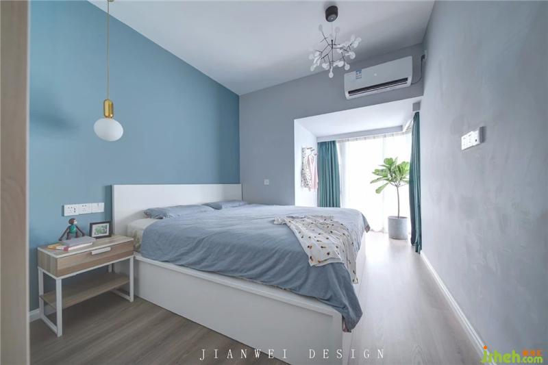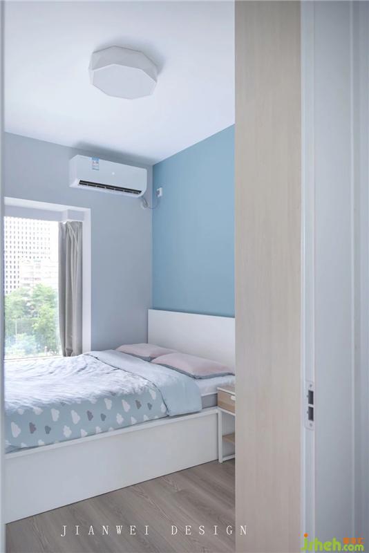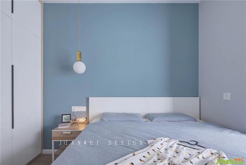 主臥選用宜家的家具,淺木色的特里索床頭柜和同色系的地板完美呼應(yīng)。白色的馬爾姆床在整個(gè)空間中低調(diào)不張揚(yáng),安靜地融入藍(lán)色和灰色交接的墻面。