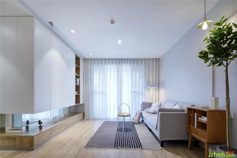 客廳取消了傳統(tǒng)的電視背景墻的形式,投影+轉(zhuǎn)角收納柜,在實用的基礎(chǔ)上兼顧對美的考究。裝修設(shè)計
