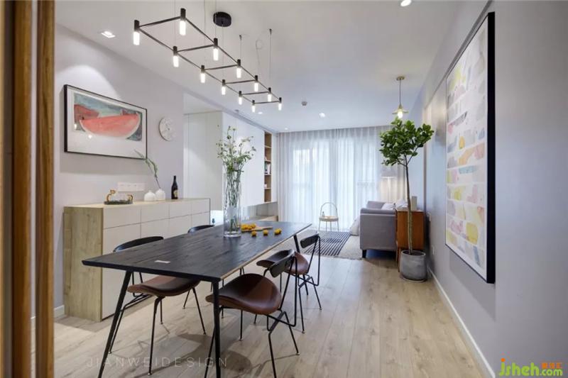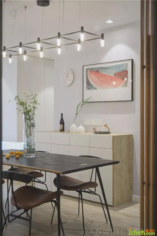 一側(cè)的餐邊柜是保證整潔餐桌的必備收納神器,臺面上預(yù)留的多孔電源,方便一切家庭小電器的靈活使用。墻上的裝飾畫給人一種“得閑飲茶吃瓜”的放松感。