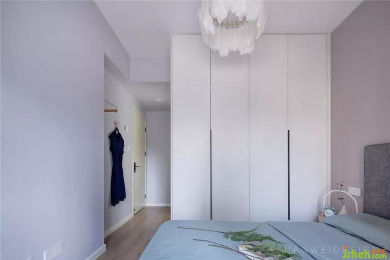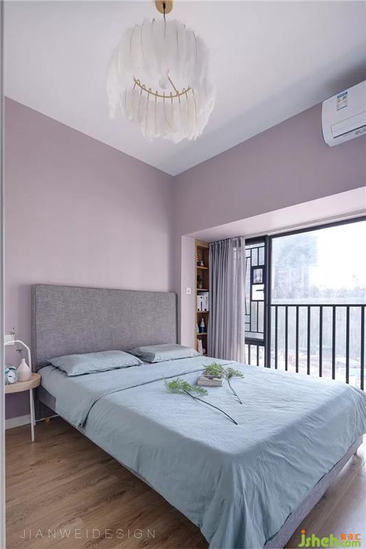 主臥灰和粉的相遇非常寧靜柔和,黃銅+羽毛質感的吊燈柔化光線,溫馨而柔軟。裝修設計