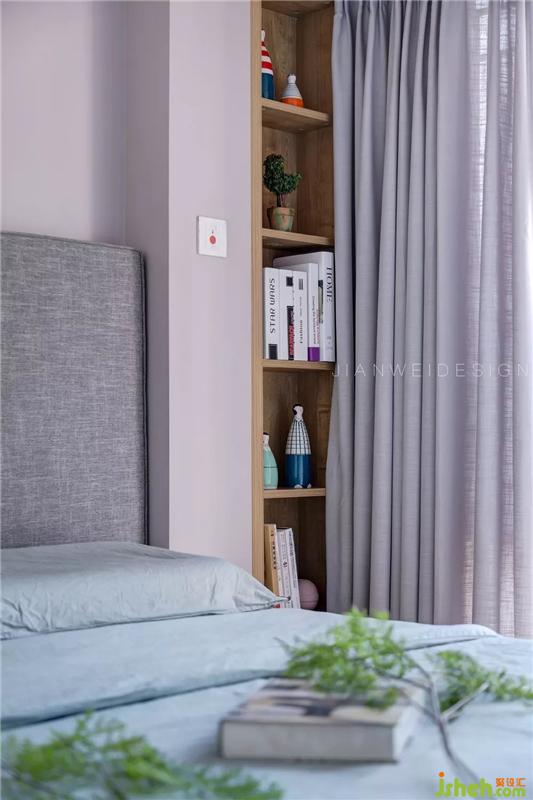 一側的定制書架鑲嵌在墻體里,合理的空間利用讓喜愛讀書的屋主方便閱讀。裝修設計