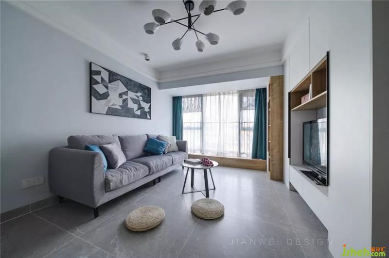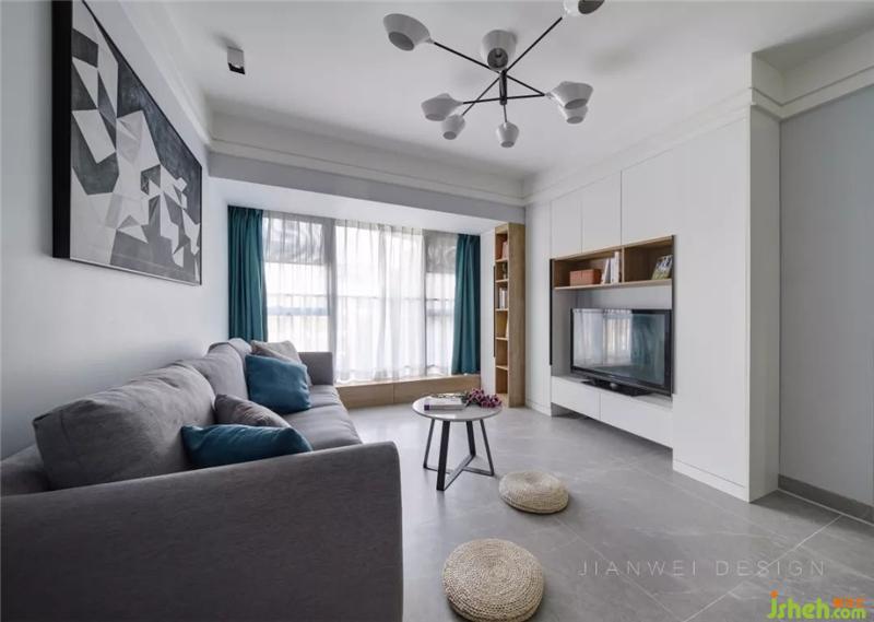 大三人沙發(fā)滿足了家庭所需,灰色的布藝沙發(fā)搭配孔雀藍(lán)的抱枕和同色系的窗簾,空間的色調(diào)和諧統(tǒng)一,充滿了文藝和靜謐的氣息。室內(nèi)設(shè)計(jì)師