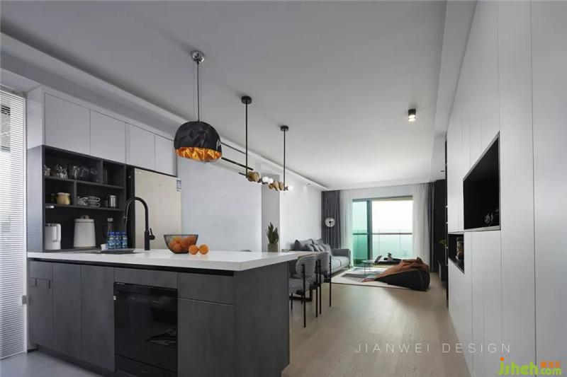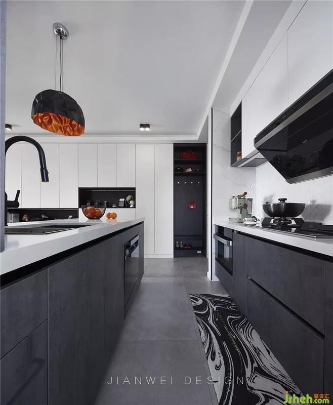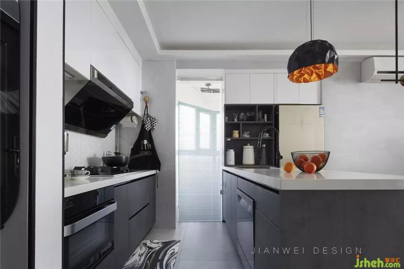 白色巖板臺面配以帶有暗紋的灰黑色櫥柜,提高了廚房的現(xiàn)代感和酷炫感。得益于電器的內(nèi)嵌和小電器柜,操作臺面達到了最大化的使用。冰箱嵌在櫥柜預留好的位置里,節(jié)省空間且提高了空間的整體性。