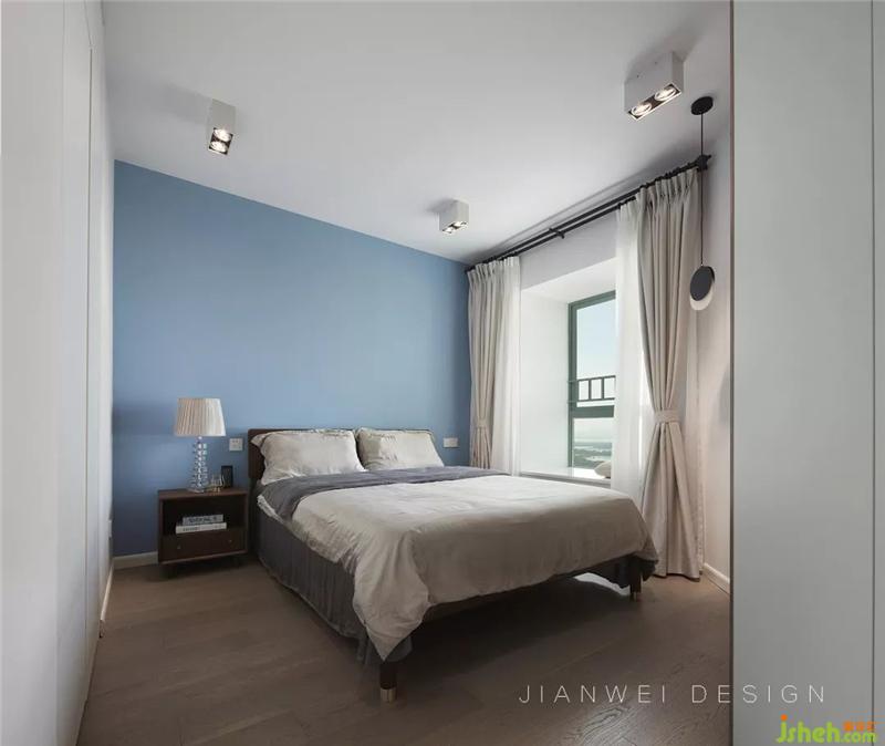 安靜的天空藍背景墻,與灰藍的天絲床品一起打造了一個舒適的睡眠區(qū)。左側(cè)的衣柜以假亂真,與墻體融合在了一起。