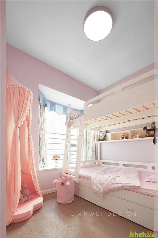 兒童房的布置天真而美好,純白的上下床,童趣的窗簾,毛線收納筐,整體的色系可愛又柔軟。