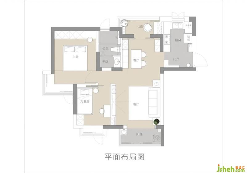 ①將原本陽(yáng)臺(tái)的位置改為書房,由原本的兩居室變成三居室。