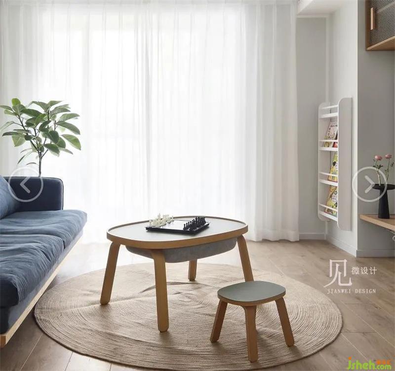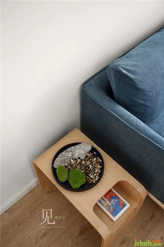 客廳整體色調(diào)以白色、原木色為主,加以低飽和度的灰藍(lán)色進(jìn)行點(diǎn)綴。室內(nèi)設(shè)計(jì)師