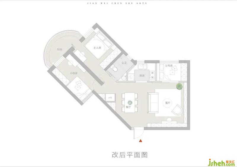 不足:原屋異形,空間規(guī)劃不夠合理,造成空間浪費(fèi);客廳采光不好,室內(nèi)昏暗;沒有獨(dú)立的餐廳。