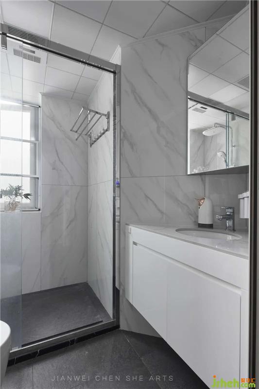 衛(wèi)生間干濕分區(qū),避免室內(nèi)空氣污濁,以之前不規(guī)整設(shè)計(jì)為契機(jī),在合適的位置剛好留出了一個(gè)三角形空間,空間得以合理利用,三角形的洗漱臺(tái)也更加有新意。