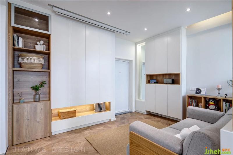 幕布后面設(shè)計(jì)了白色收納柜,盡量增加儲物空間,讓墻面的視覺更簡潔利落