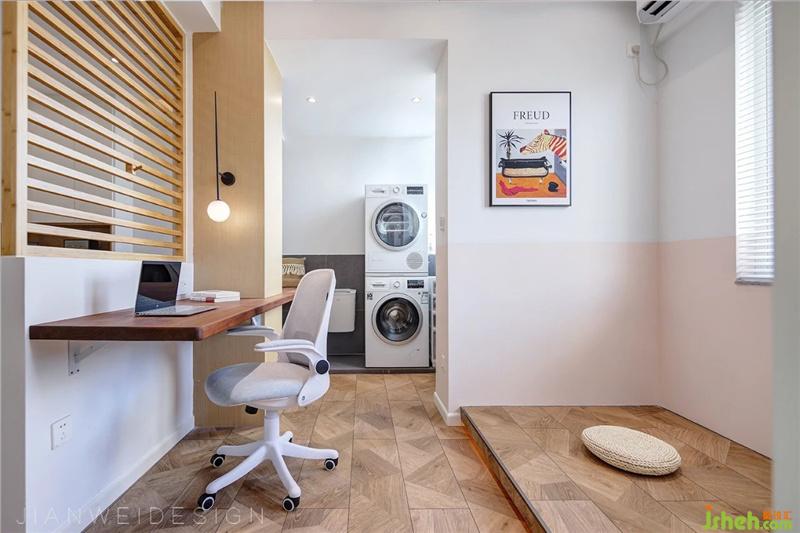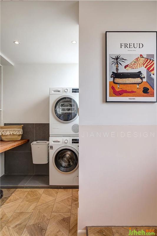 家務(wù)區(qū),摒棄傳統(tǒng)陽臺,洗烘衣機(jī)疊放,壁掛衣簍,提高了空間操作的便利性