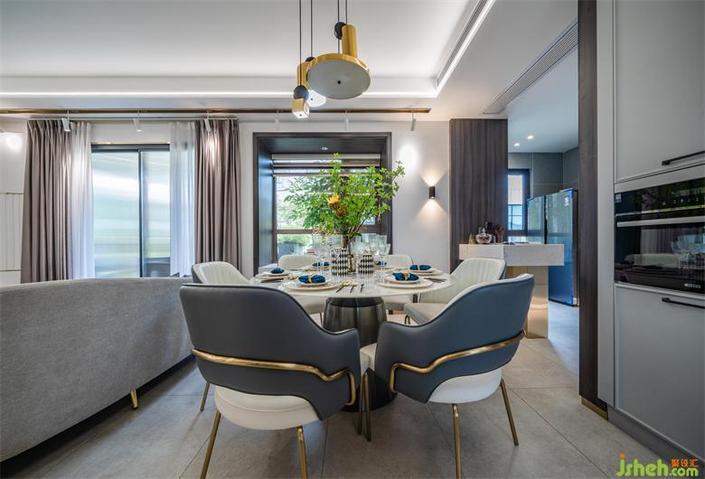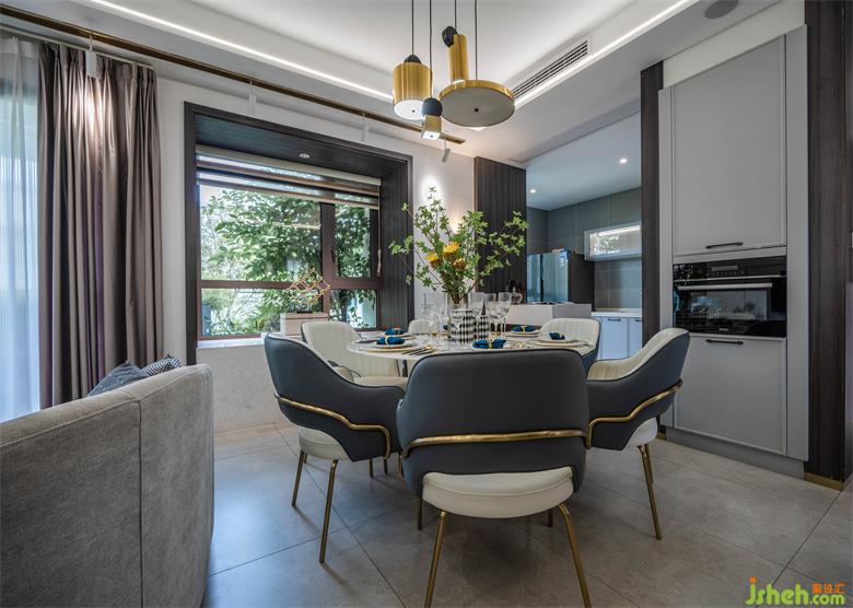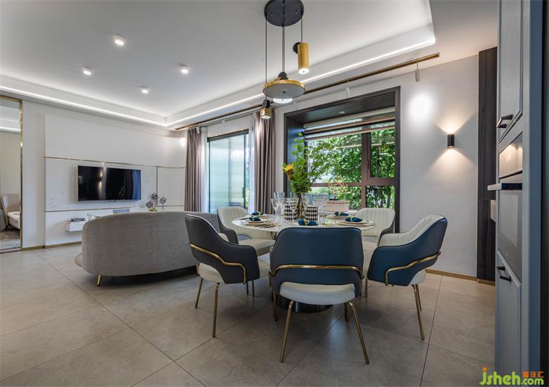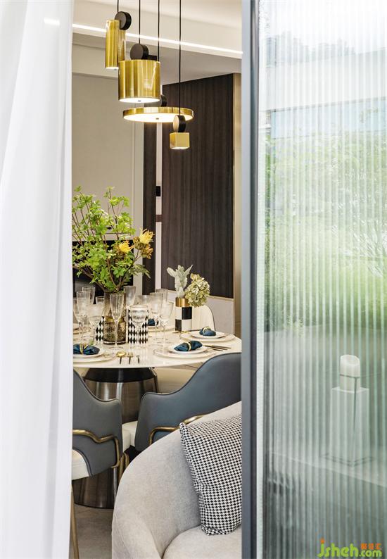 圓形餐桌、個(gè)性化裝飾品是對儀式感的追求,每日三餐,一家人在美味四溢、歡聲笑語的氛圍中,被幸福包圍。錯(cuò)落的吊燈立體感十足,家裝設(shè)計(jì)交錯(cuò)光影下的美食讓人食指大動。