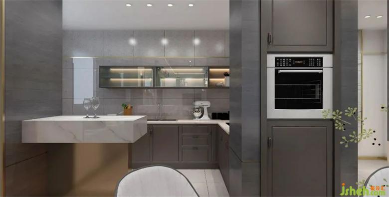 透明玻璃+灰調(diào)木制的櫥柜選擇,讓空間更加明亮。