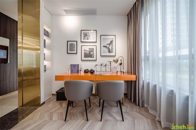 靠墻的方形橙色系明亮書桌,線條感統(tǒng)一的擺件。