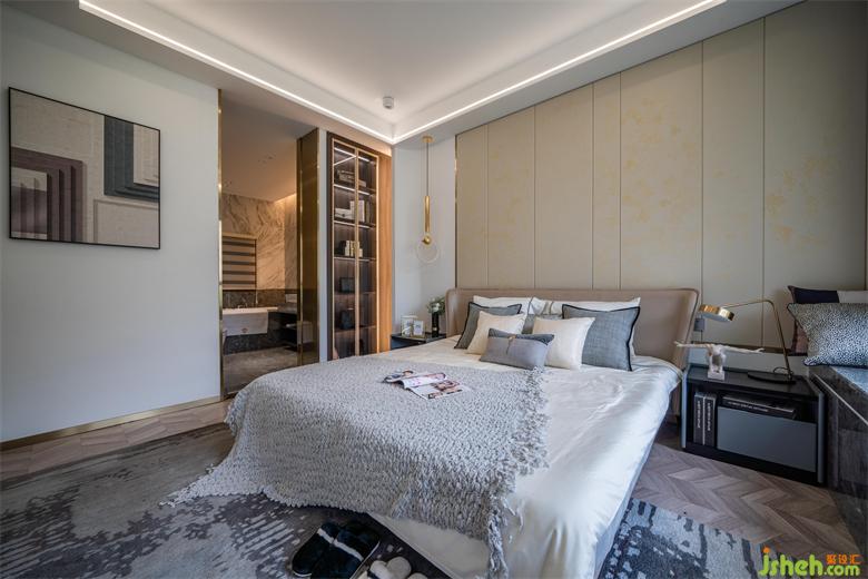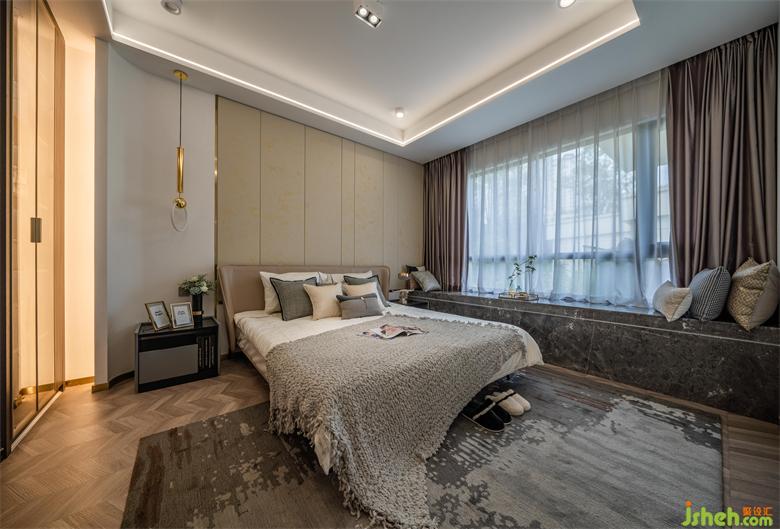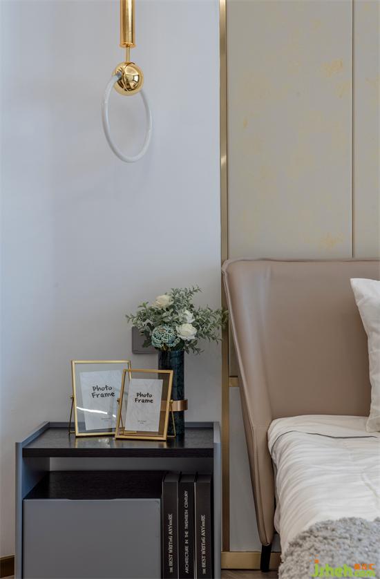 飄窗上靜靜看夜景發(fā)呆是醞釀睡意的好方法,金屬質感的床頭燈和燈帶映照下,夫妻間的私房話是睡前的甜蜜。