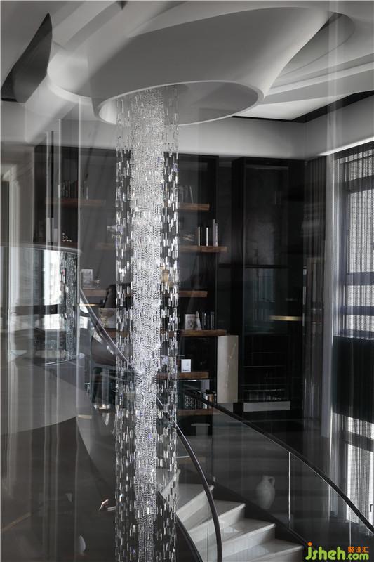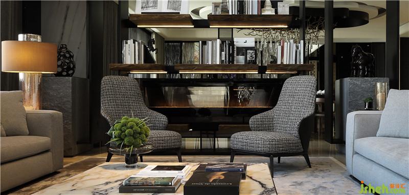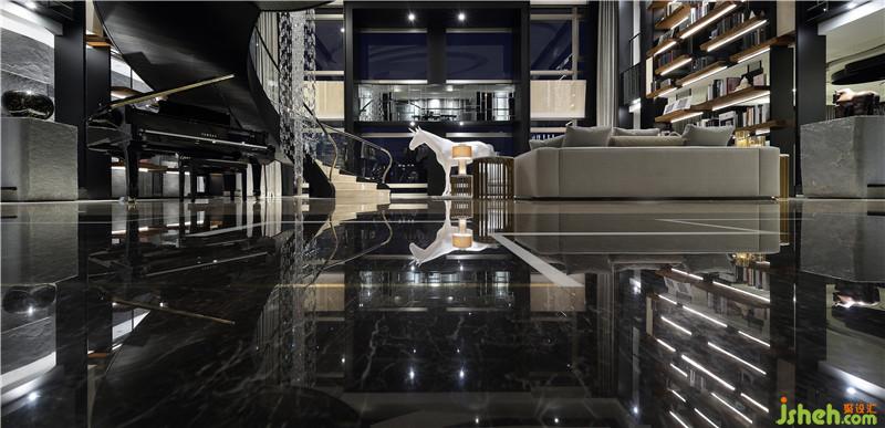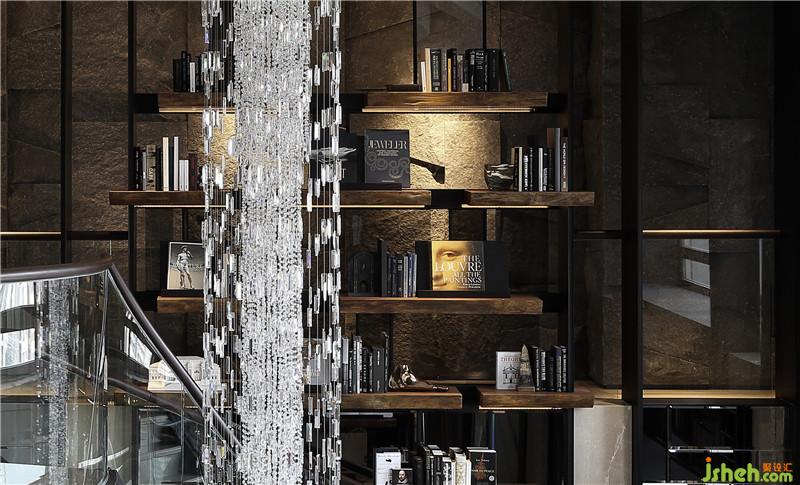 起居室作為整體空間的核心,運用挑空的建筑優(yōu)勢,搭配落地窗,創(chuàng)造廣闊的視野。地坪采圓形幾何分割,材質(zhì)精巧,搭配優(yōu)雅的弧形旋轉(zhuǎn)梯,盤繞于6米高的水晶燈由天花板,延續(xù)至整個空間創(chuàng)造大宅的氣度正式性。左右兩側(cè)高聳的書墻,挑高梁帶利用鏡面分割空間放大與修飾梁帶線條,鐵件搭配實木,光線安排讓整體書墻更精致。梁帶使用石材及劈面石材互相搭配,凸顯變化與空間肌理。書墻搭配后方預(yù)設(shè)的通道,使視覺層次提高,讓人可靠著俯視,呈現(xiàn)