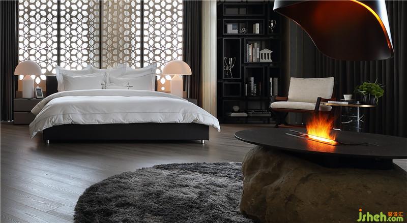 次男房風(fēng)格設(shè)定為現(xiàn)代極簡,格局開放穿透設(shè)有夜間品酒、訪客聚會,客制化吊飾壁爐、等功能,石桌板挖孔崁入水霧型壁爐,搭配弧形沙發(fā)組,感覺就像在夜店與朋友品酒,穿透式雷射切割木板隔屏,串聯(lián)更衣區(qū)及臥室區(qū),完全不