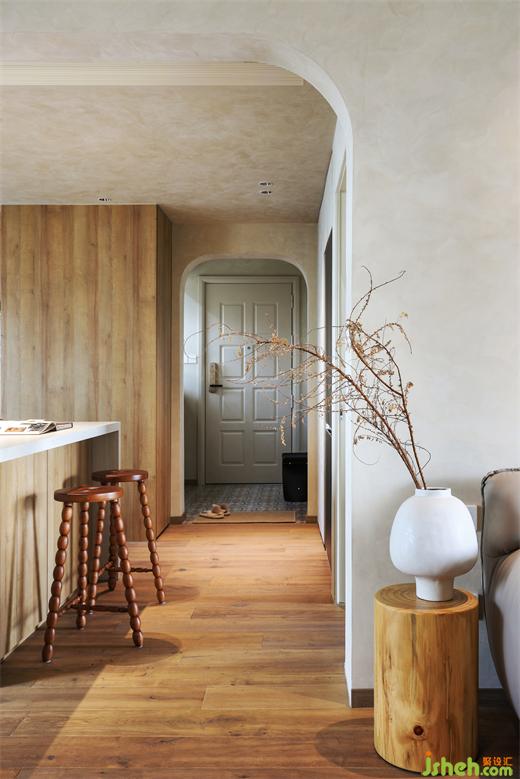 屋主買房時,入戶這個位置是贈送了一個入戶花園的,亞運城天峯家裝設計我們就把玄關區(qū)域從原始的位置挪出來,放置在入戶花園這里,為了不影響采光,我們鞋柜區(qū)域只做了一米高,因為空間結(jié)構問題鞋柜區(qū)域的深度足足有55公分深,為了解決過深的柜體造成的鞋柜笨重問題,我們在鞋柜上方設置了一排抽屜,既方便又實用,質(zhì)樸木紋紋理結(jié)合黃銅的小把手,簡約又不失雅致,柜體和結(jié)構承重梁位的弧形過渡,都在視覺上弱化了這個笨重感的問題。鞋柜的小細節(jié)包括強弱電箱刷了和墻體相同的藝術涂料,入戶門的顏色也是按照涂料的顏色去選擇的,焦糖色的小花磚、入戶異形的鏡子、黑色的蝴蝶凳子,棉麻的白色紗簾、過道的拱形元素,裝修公司在這豐富的視覺層次下,濃郁的居家氛圍感呼之欲出,自然溫柔有力量。