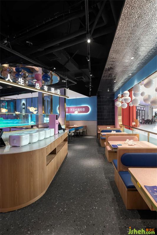 烤魚餐廳設(shè)計藝術(shù)涂料的柔性協(xié)調(diào)與不銹鋼金屬質(zhì)感的碰撞,一剛一柔,碰撞出遇見的火花。