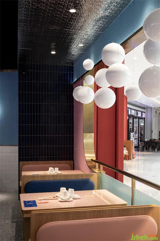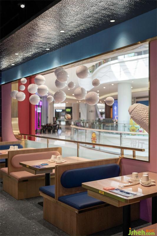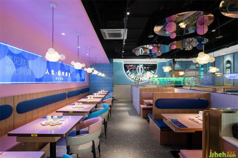 天花水波紋板的處理,加上燈光營造,呈現(xiàn)出水波光粼粼的感覺,仿佛置身在水中遨游,體驗大海給自己聲臨其境之感。