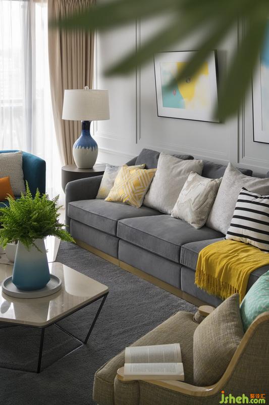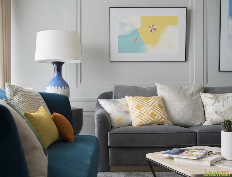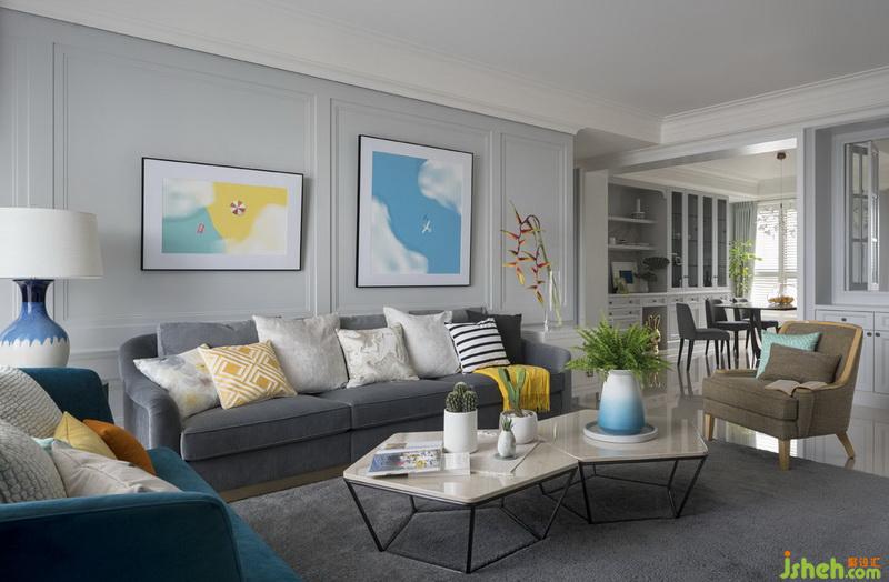 ▲客廳-多色繽紛抱枕,加上主題性的訂制畫作,循序鋪陳出如走入度假島嶼的愜意風(fēng)光,也融入夫妻倆遨游天際的職業(yè)及故事性。