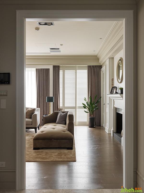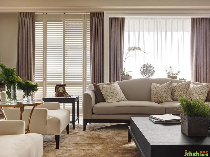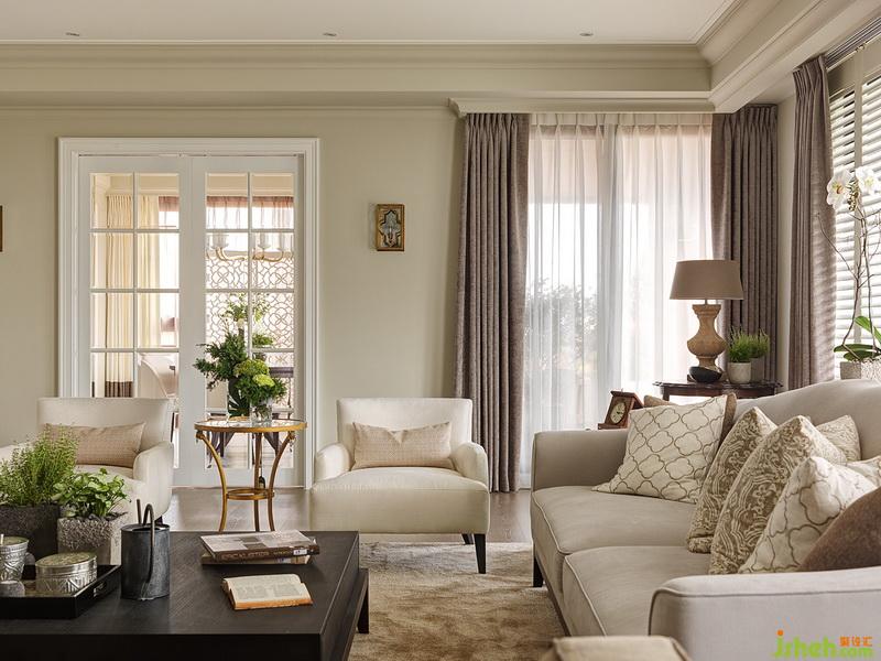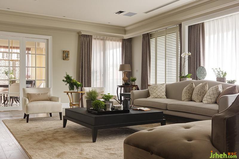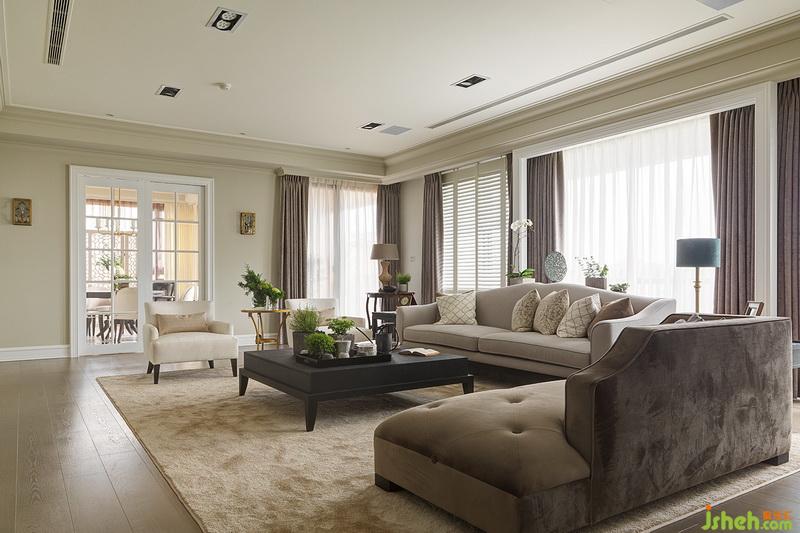壁面色彩向天花板延伸,并為大片窗加上淡雅色系的窗簾、窗紗,整個視覺更為安定及放松。室內(nèi)設(shè)計師