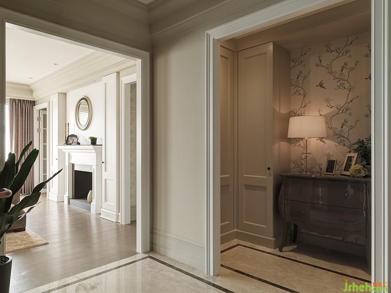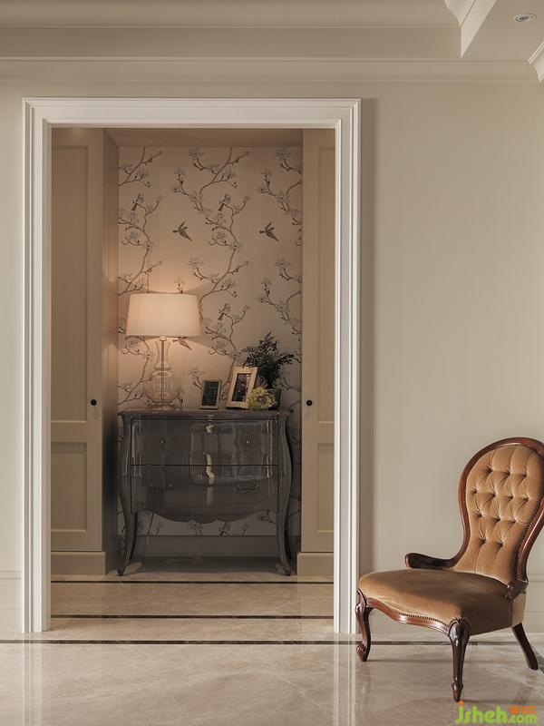 素雅的花鳥刺繡壁紙前,由雅致的端景柜、臺燈及相框布置而成,營造家的溫暖意象。