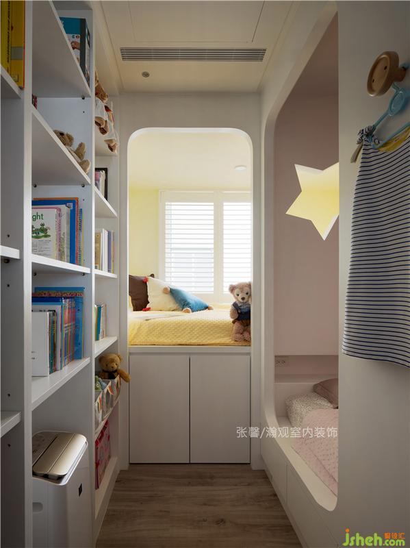兩個女孩的年齡相差不大,我們以L型上下鋪,加上星星造型開窗,讓孩子們的童年多了點趣味。上層睡榻下方更設(shè)置大型行李箱放置空間,收納于無形,創(chuàng)造出大收納量。室內(nèi)設(shè)計師