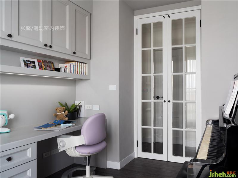 重視孩子們閱讀習(xí)慣,特意設(shè)置書房,書桌及墻面同樣采用特殊處理,可以讓孩子們盡情天馬行空地作畫,只要用濕抹布即可擦拭干凈。另一側(cè)放置鋼琴,讓空間既是書房也是琴房。
