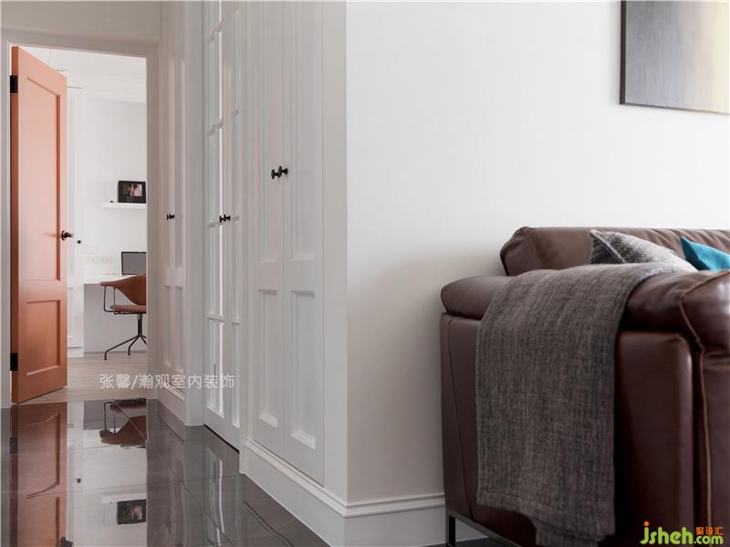 廊道設(shè)置孩子們的衣柜,增加收納空間之余,美式線條的門片,也為走廊增添一道景致。