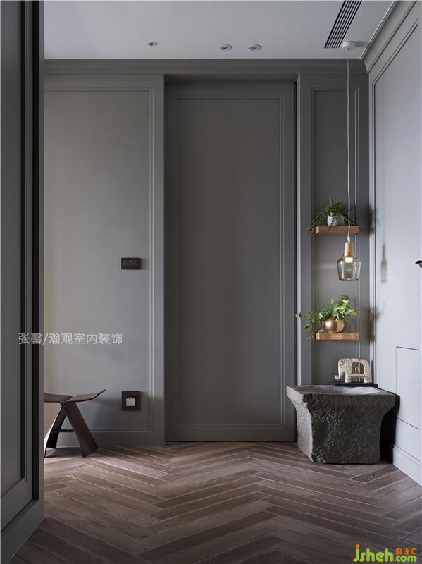 入口玄關(guān),基底采用干凈簡單的美式線條,并以人字拼貼的木紋磚營造休閑感,與屋主私藏的石臼盆器相映出小中式韻味;夜晚點起的一盞垂墜燈飾,讓疲累返家的家人們,心底自然暖暖的。室內(nèi)設(shè)計師