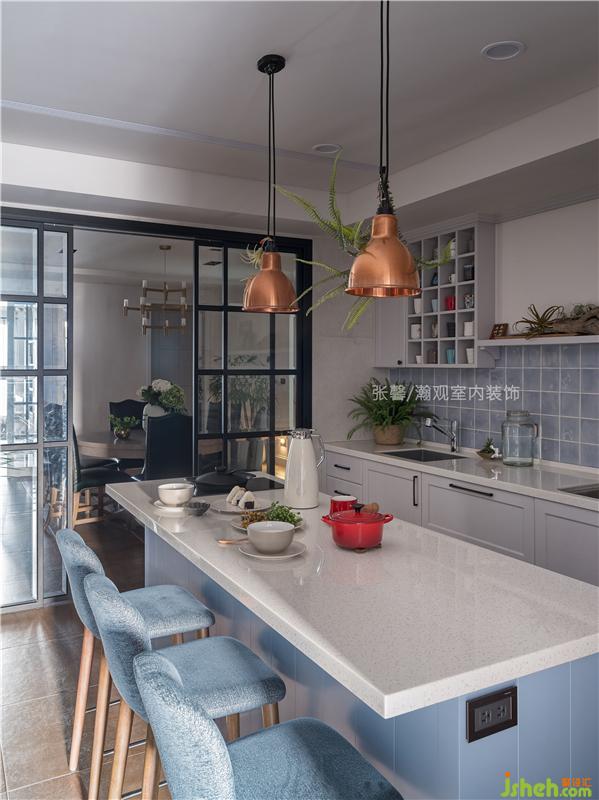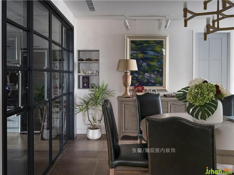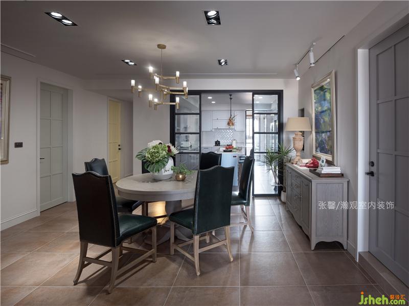 餐廳是屋主一家的互動中心,選用圓形餐桌方便一家對話交流,古典釘扣的餐椅與造型燈飾將餐廳氛圍營造得更加溫暖,還特意留有足夠空間,讓孩子們自由跑跳活動。室內(nèi)設(shè)計師