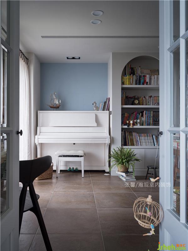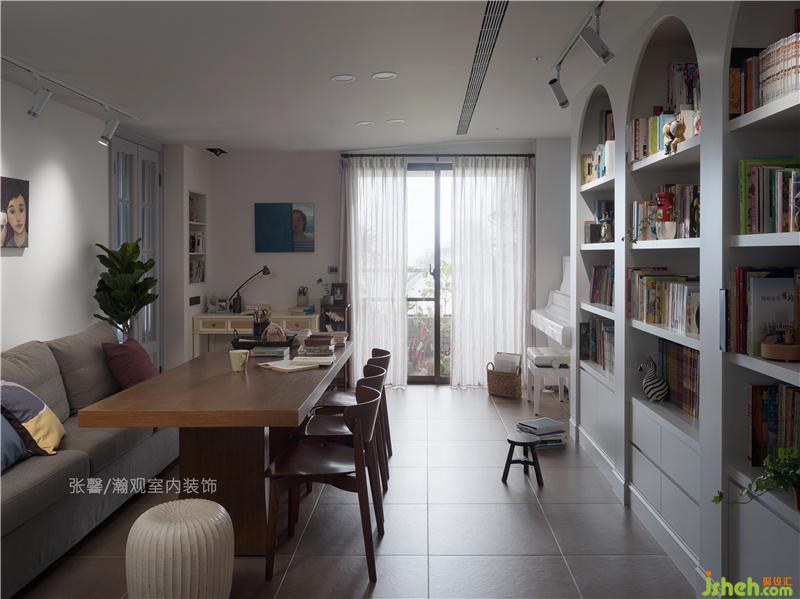大尺度的書(shū)房結(jié)合琴房,整面落地的書(shū)柜,供一家五口的叢書(shū)收納,小巧的擺飾是屋主太太的童心,而擺放可以容量一家大小的書(shū)桌,一邊是哥哥靠著爸爸看著童書(shū),一旁是姊姊依偎媽媽?zhuān)号姥缹W(xué)語(yǔ)的弟弟,抑或是哥哥做著手作,姊姊就彈著琴教弟弟哼兒歌,這時(shí)爸媽就倒杯茶,看著孩子們玩耍,一家子的假日午后就悠悠度過(guò)。室內(nèi)設(shè)計(jì)師
