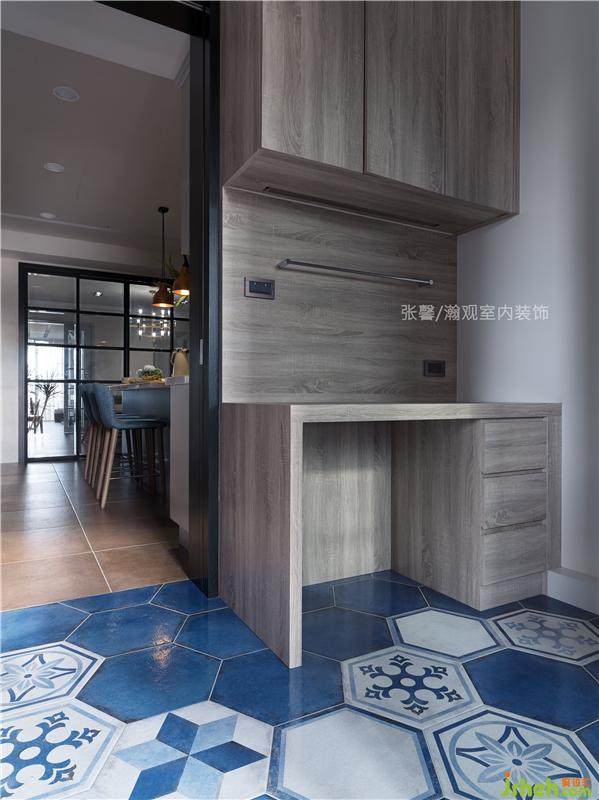 因應(yīng)一家五口的衣物量,洗后整理衣物的家務(wù)時(shí)間不短,因此在廚房與陽(yáng)臺(tái)之間規(guī)劃出家事間,設(shè)置平臺(tái)以及收納柜,方便屋主太太折衣物及熨燙,相關(guān)備品也有妥善的收納空間,家中自然不會(huì)凌亂。室內(nèi)設(shè)計(jì)師