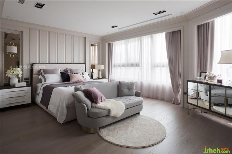 主臥房,為制造安穩(wěn)的睡眠區(qū),我們以古典框切割大面窗,線條制造出溫馨氣息,只要再添加鏡面柜體及銹蝕鏡增加華麗度即可。