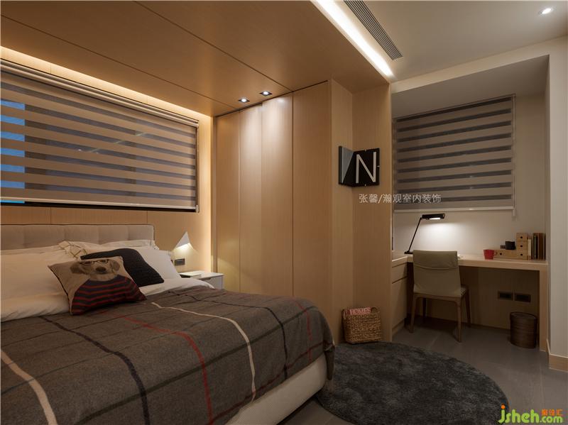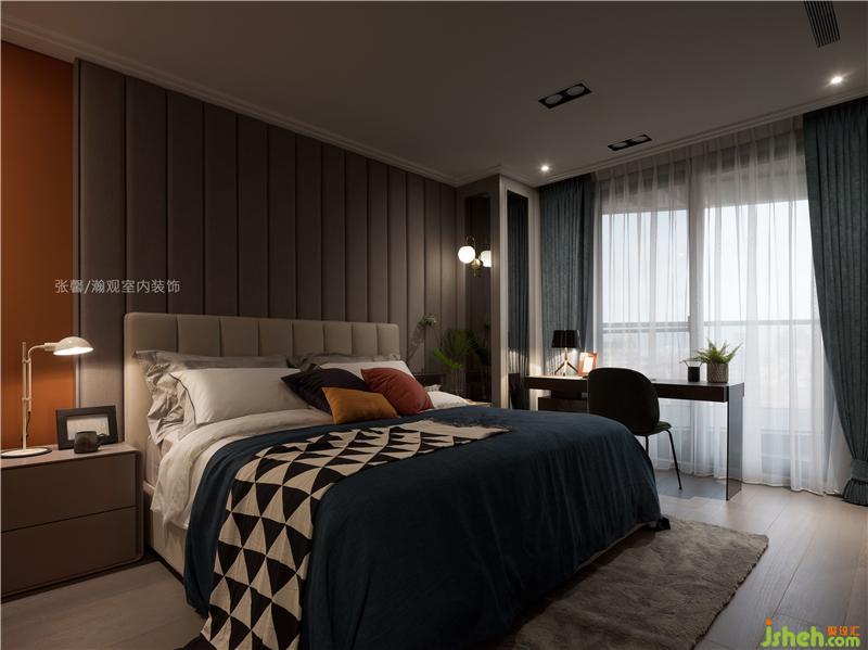 為讓屋主有著不同感受,我們將臥室訂為不同主題,這間帶點(diǎn)都會(huì)氣息,并翻玩色彩。雖有較多大面積色塊,但因?yàn)閷⒘炼冉档?,并不?huì)覺得眼花撩亂,反而成了特色亮點(diǎn)。
