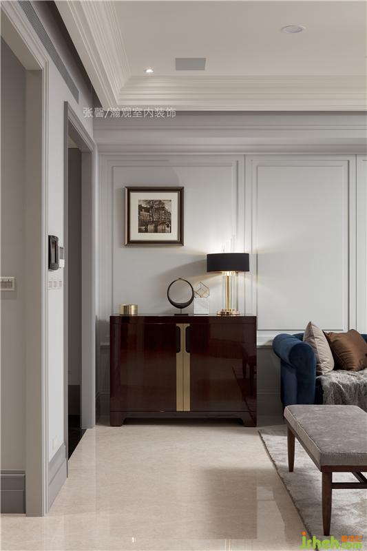 更衣室延續(xù)著香草色彩,視覺不紊亂,有著簡(jiǎn)單美式線條,以水晶燈飾凸顯屋主的精致格調(diào)。