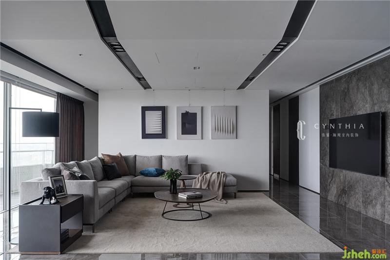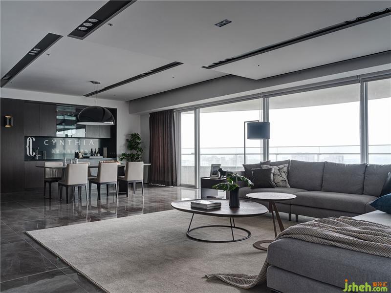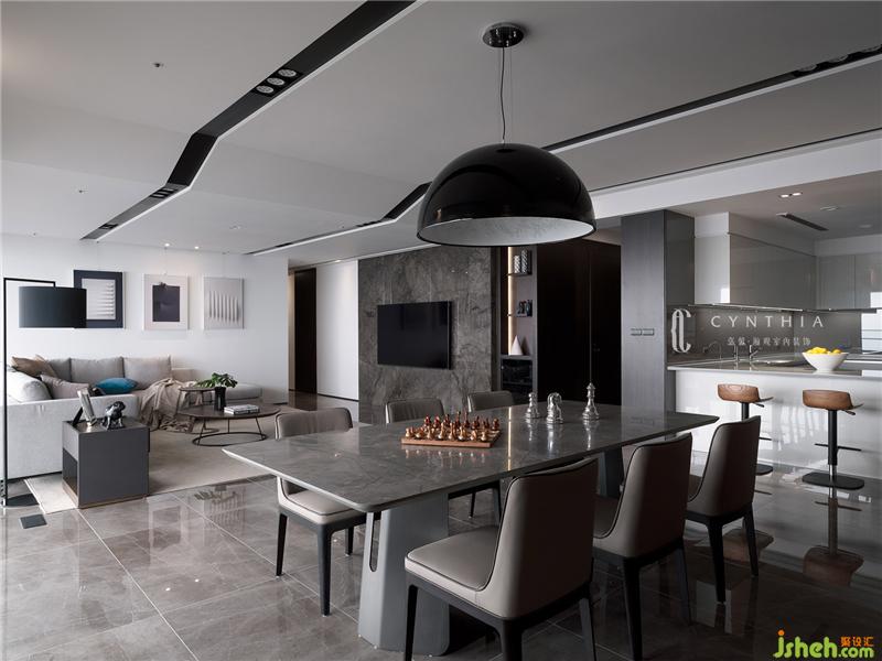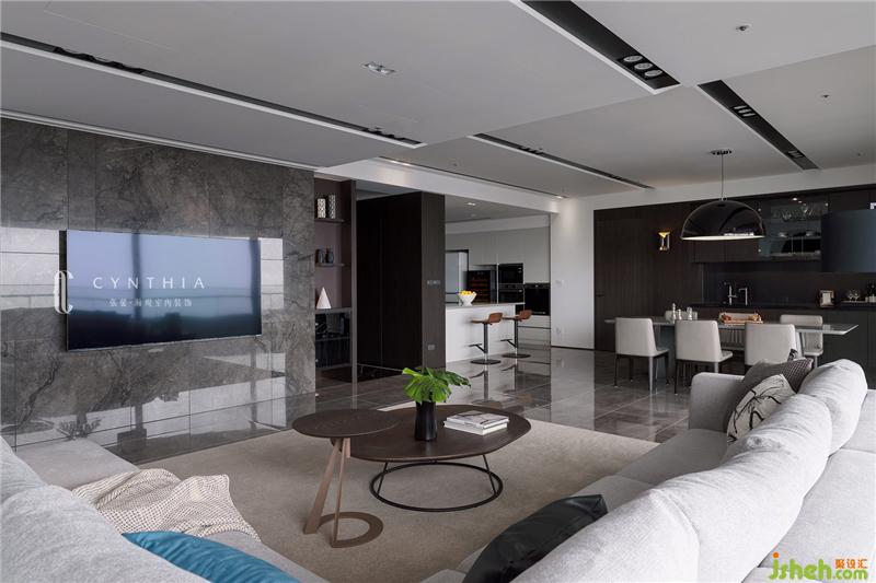 挑選帶有紋理的深色大理石,讓空間里的色彩比例平衡;家具挑選中性的灰色調(diào),僅在抱枕軟件上跳色,注入亮點色彩,維持豁然氛圍。