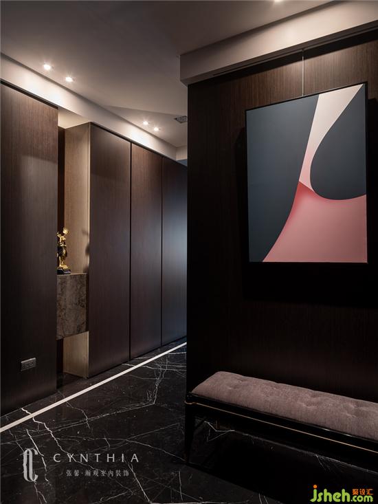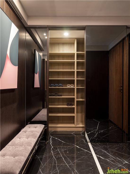 挑選深色鑲嵌白邊的石磚,在玄關(guān)創(chuàng)造出大器質(zhì)感,備齊機能,一旁設(shè)置鞋柜滿足一家收納鞋量,利用收納柜體型塑出深遠(yuǎn)的廊道,也能展示出屋主的私人收藏。