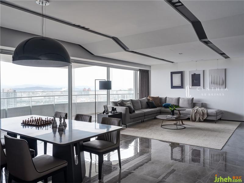 以黑白灰色系為基底的公領(lǐng)域,擁有屋主喜歡的大面觀景窗,我們將屋內(nèi)的設(shè)計線條減到最少,讓視線自然望向窗外。屋況原有大梁的問題,我們不以包梁為解決之道,改以折線的天花造型,順勢與遠(yuǎn)處綿延山峰相映。