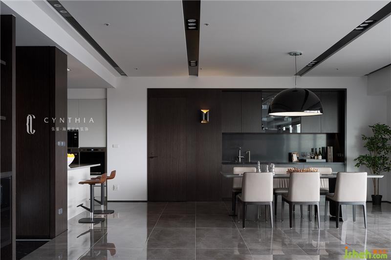 餐廳與客廳相互串聯(lián),加大使用場域,深色的木皮延續(xù)客廳的內(nèi)斂質(zhì)感,家居裝修為了不讓空間擁有過多的框線,也隱藏了通往主臥房的門扇,并以一盞精致的壁燈凸顯出格調(diào)品味。