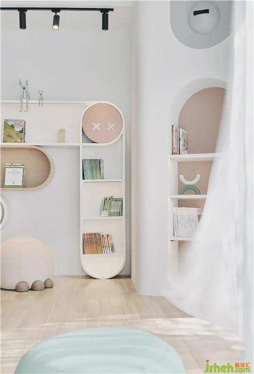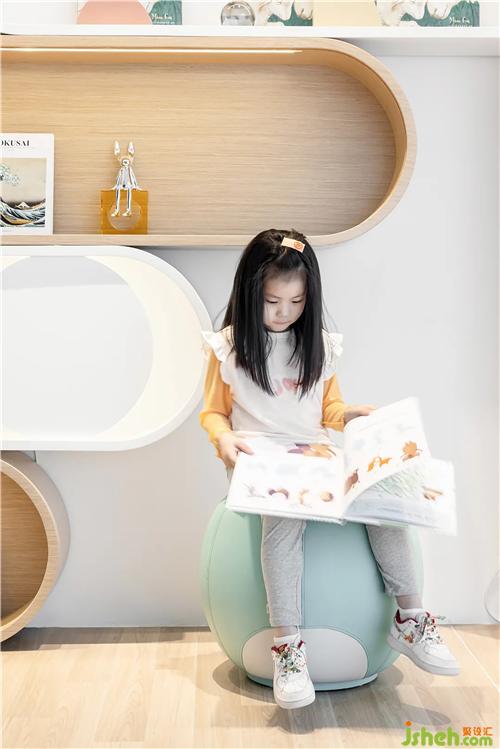 The lounge area is sedate and light camel-colored, with sci-fi lighting and lively bookshelves. The space is dynamic and clean. The globe-shaped bookshelves are like planets in the universe, allowing children to roam in their infinite imagination.