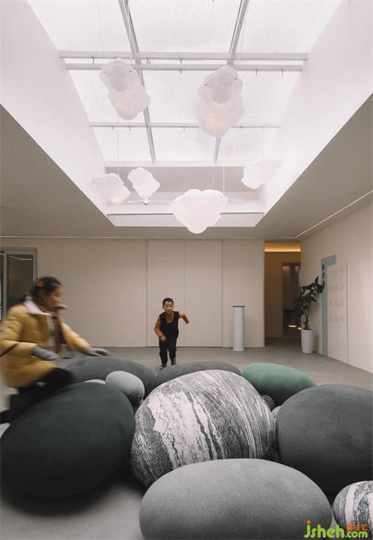 延續(xù)內(nèi)外一致性,活動室入口中庭頂部采用陽光板以呼應(yīng)建筑外部,產(chǎn)生曖昧關(guān)系。四周被分解的空間單元通過中庭軸線再次統(tǒng)一起來,加固的結(jié)構(gòu)支撐方式則將地面釋放與使用者。