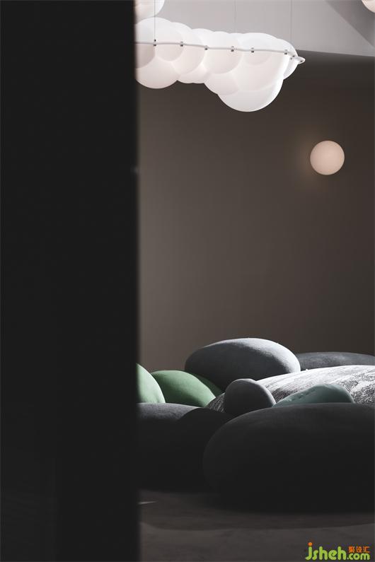 橢圓形下沉區(qū)采用軟包堆疊覆蓋的形式,創(chuàng)造性為孩子們構(gòu)筑一個柔軟的“小窩”。電視墻則后退式隱匿于片墻之中,搭配動態(tài)升降裝置以“動態(tài)+科技+藝術(shù)”手法營造多維展示空間。